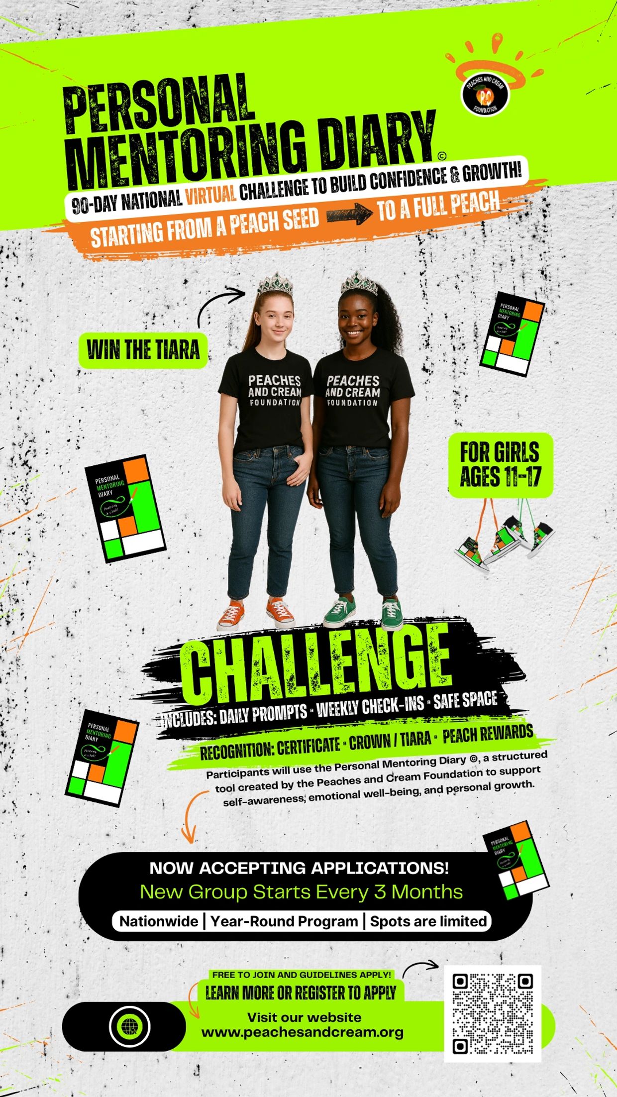 The Peaches and Cream Foundation’s 90‑Day Personal Mentoring Diary Challenge is a guided, uplifting program powered by the Personal Mentoring Diary. This structured tool supports self‑awareness, emotional well‑being, and personal growth while helping girls build confidence, leadership, and purpose.